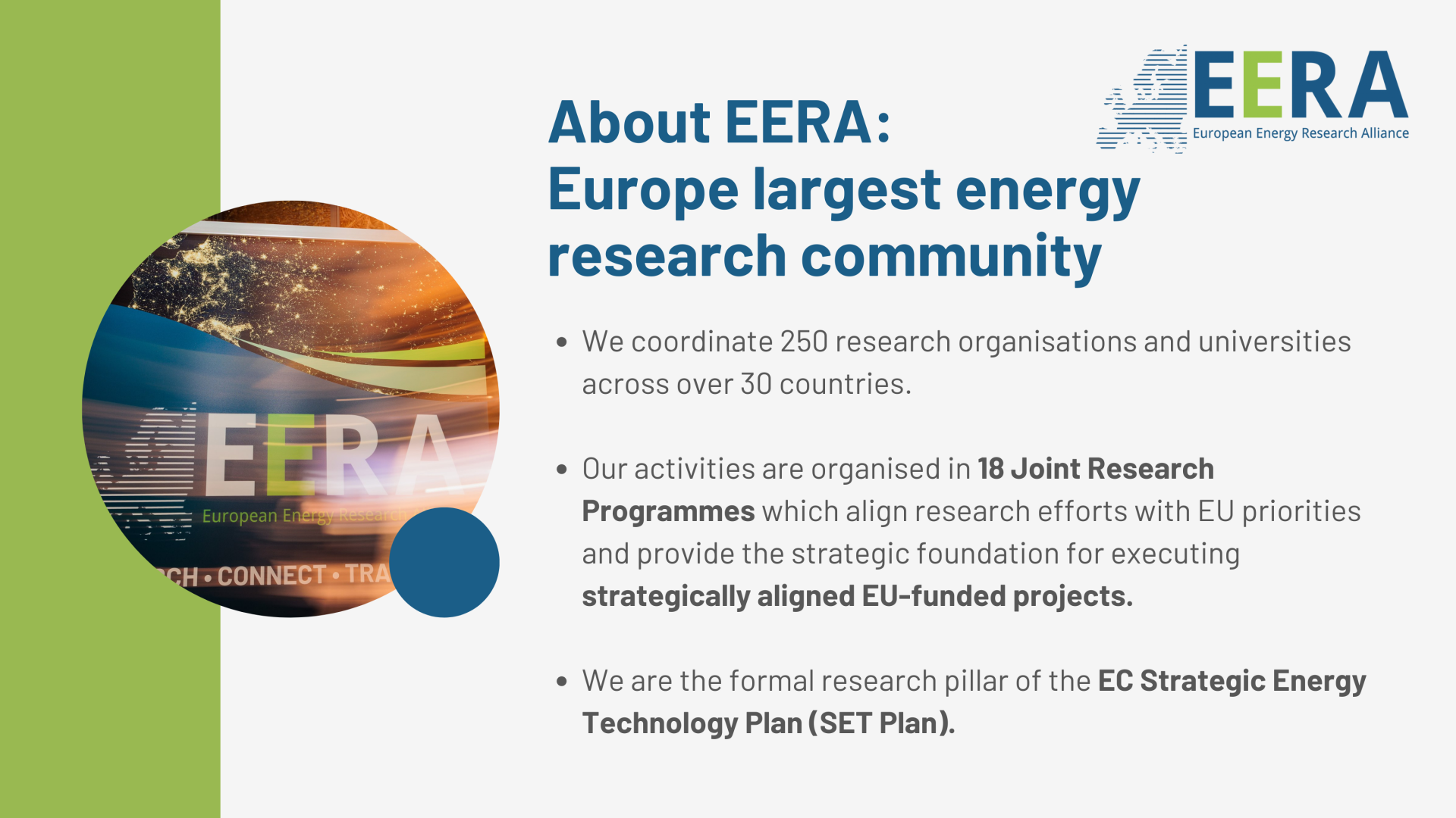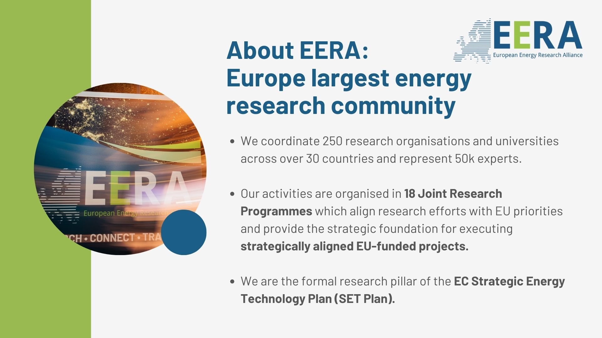 The European Energy Research Alliance (EERA) is a membership-based, non-profit association, constituting the largest low-carbon energy research community in Europe and a key player in the European Union's Strategic Energy Technology (SET) Plan. It was established in 2008 by leading research institutes to expand and optimise EU energy research capabilities. Today it brings together more than 250 organisations from over 30 countries.