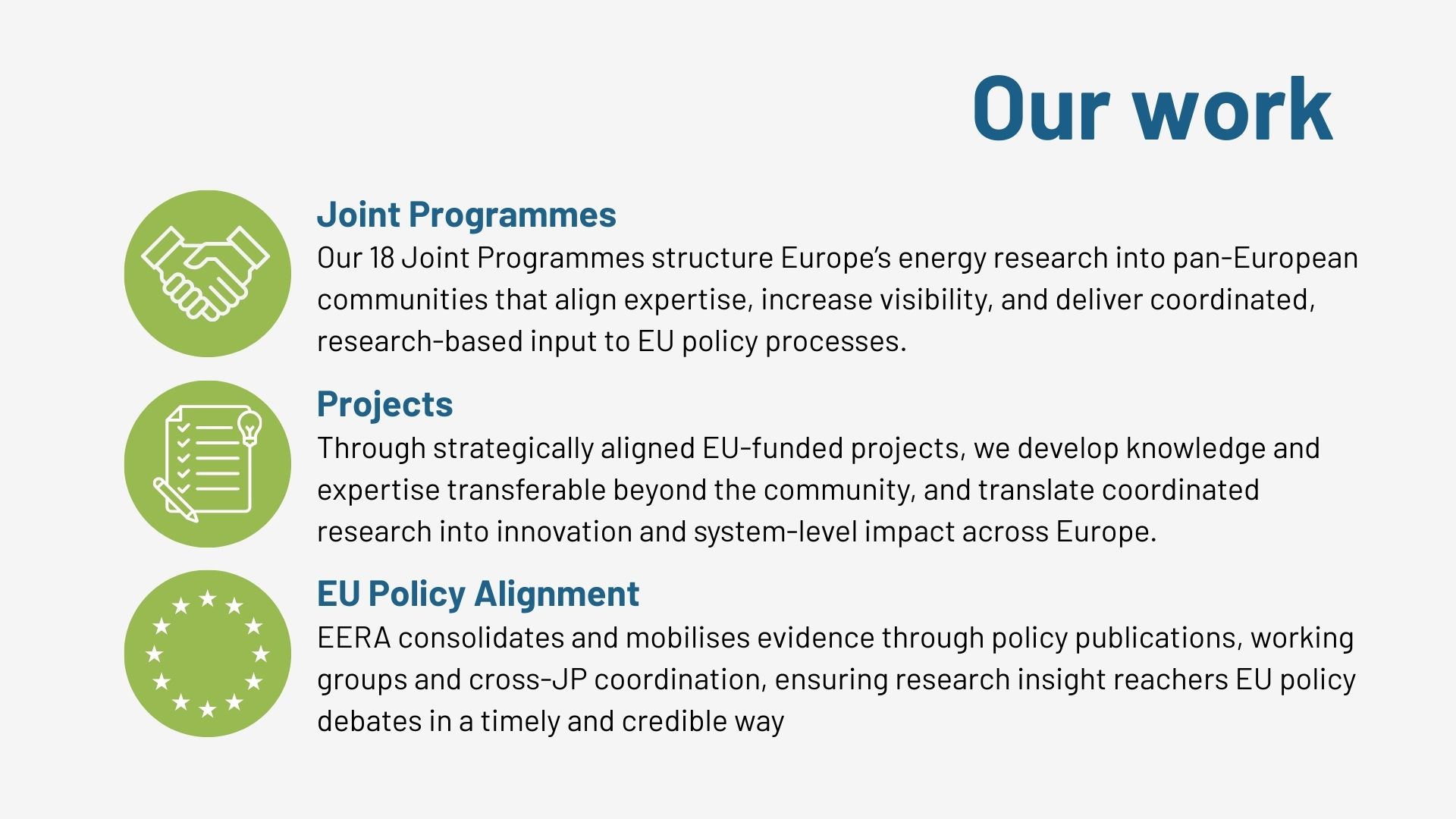 EERA coordinates its activities through 18 Joint Programmes that provide world-leading scientific expertise on three pillars: low-carbon technologies, materials, and systems' topics.